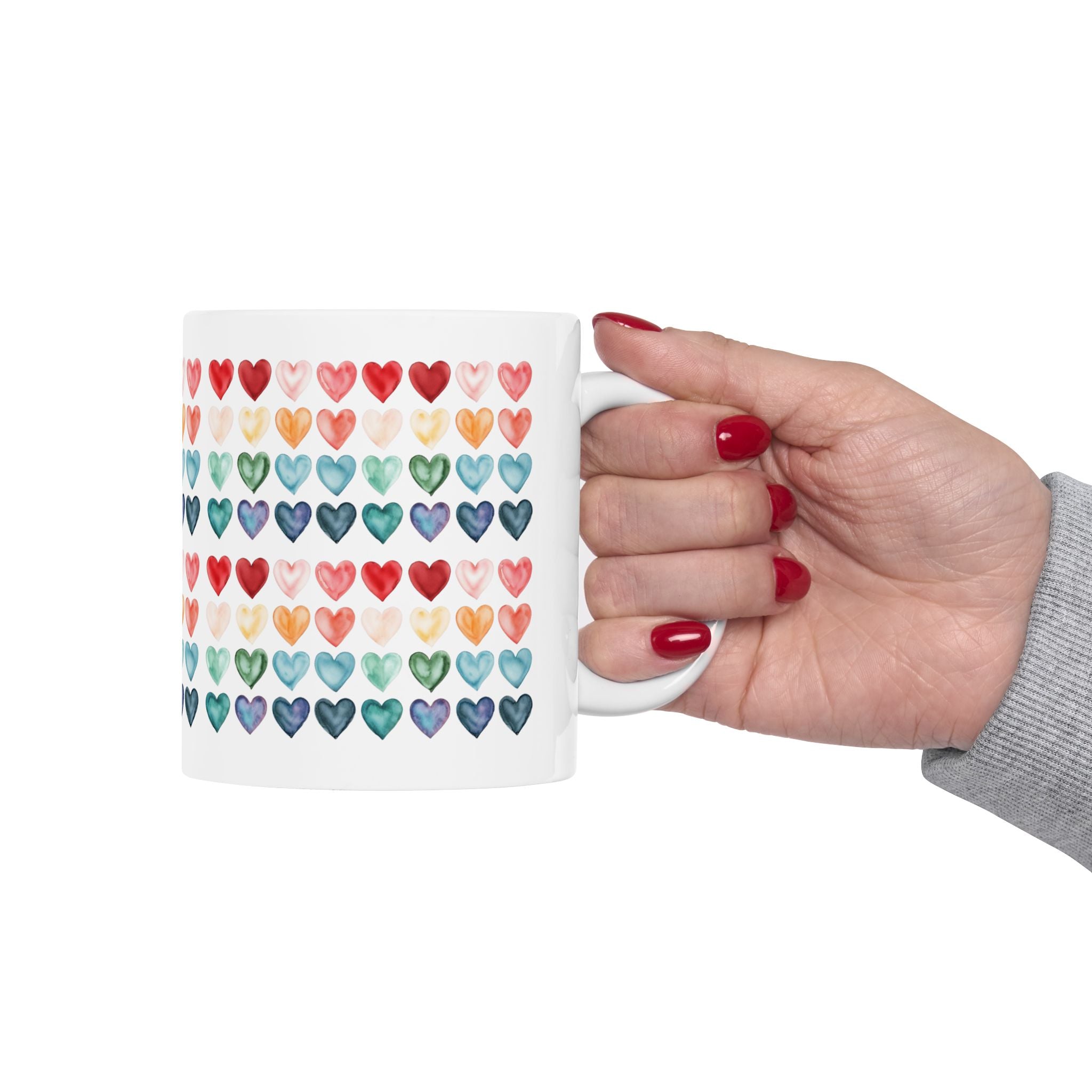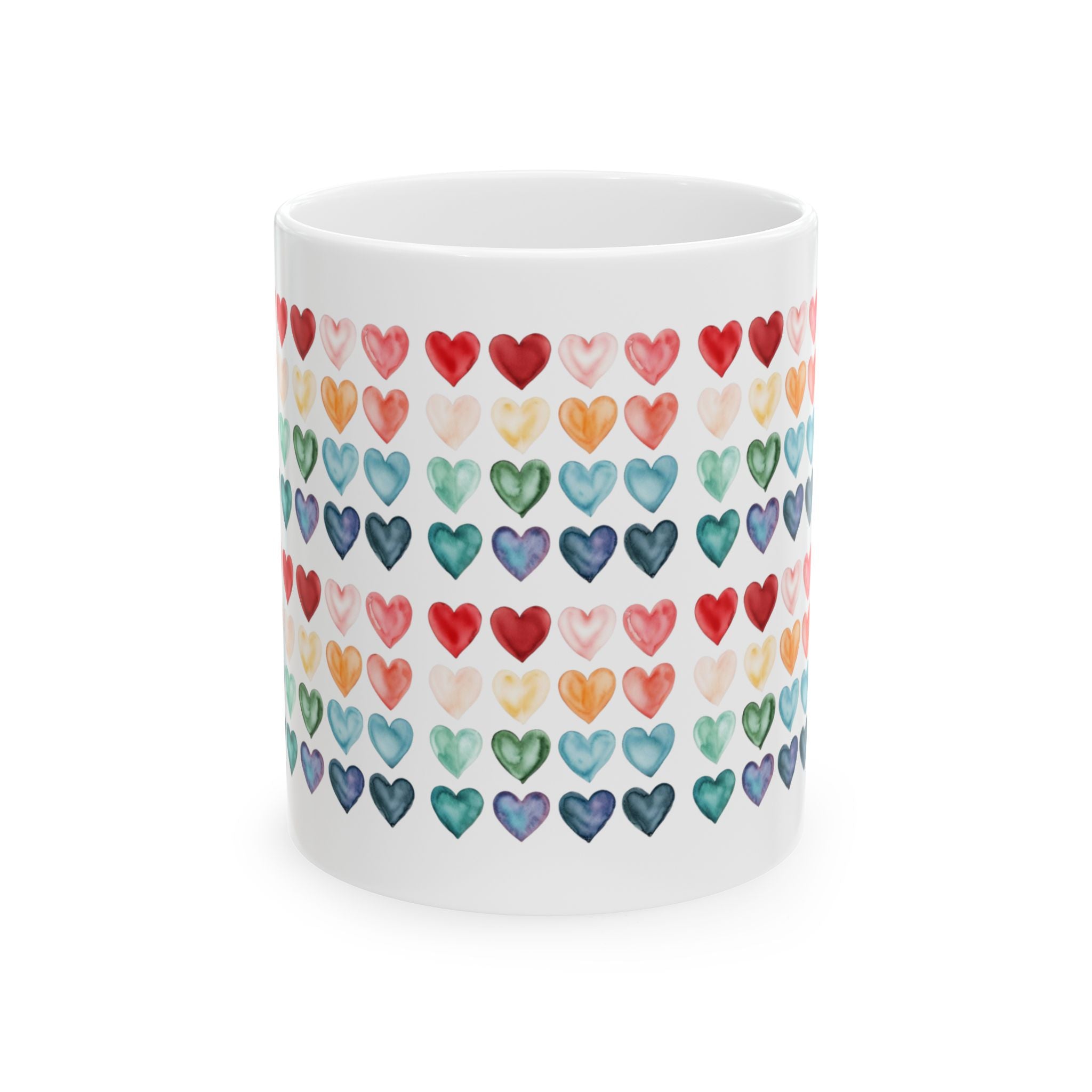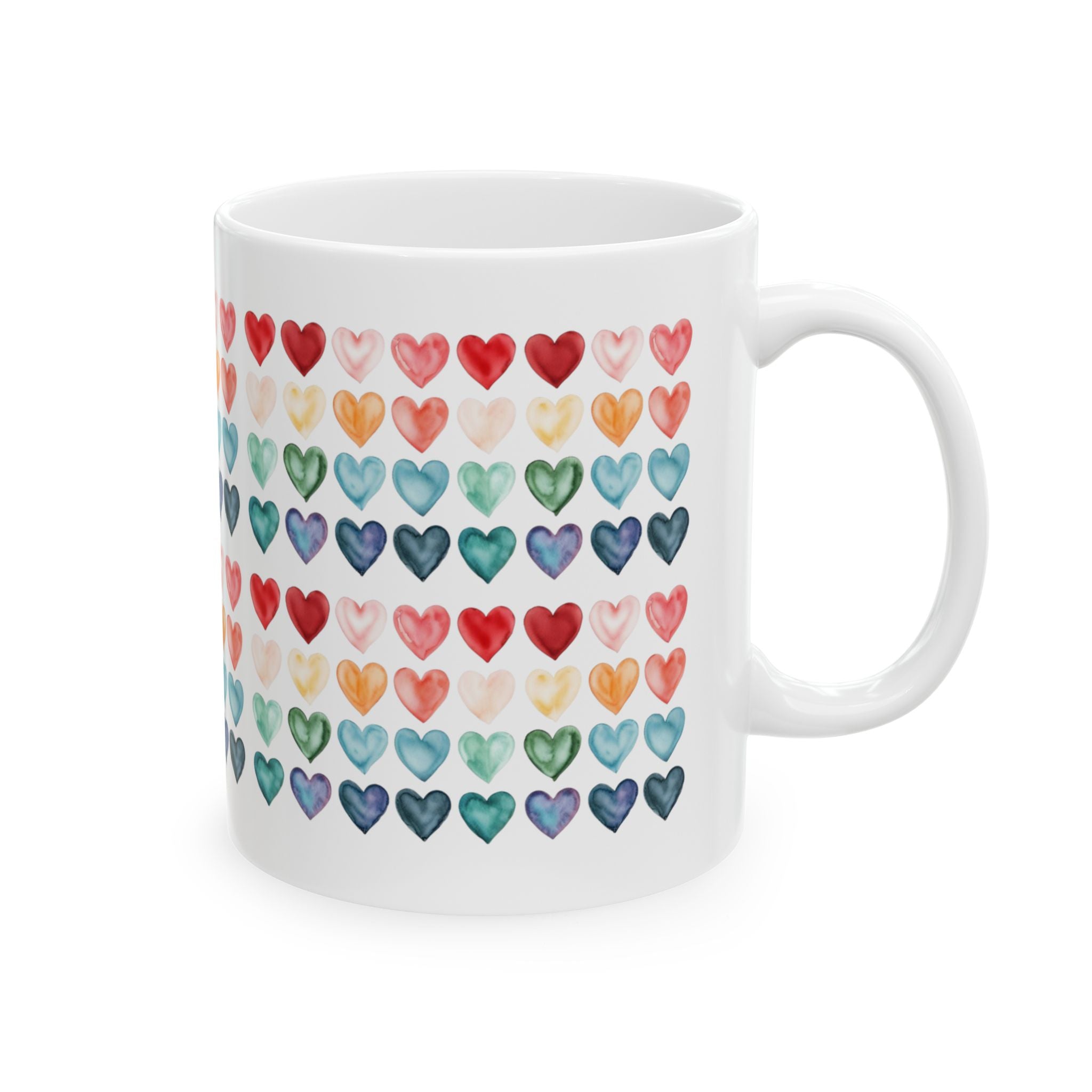 Colorful Watercolor Hearts Mug – Love Pattern Coffee Cup, Cute Romantic Gift, Ceramic Tea Mug 11oz 15oz
