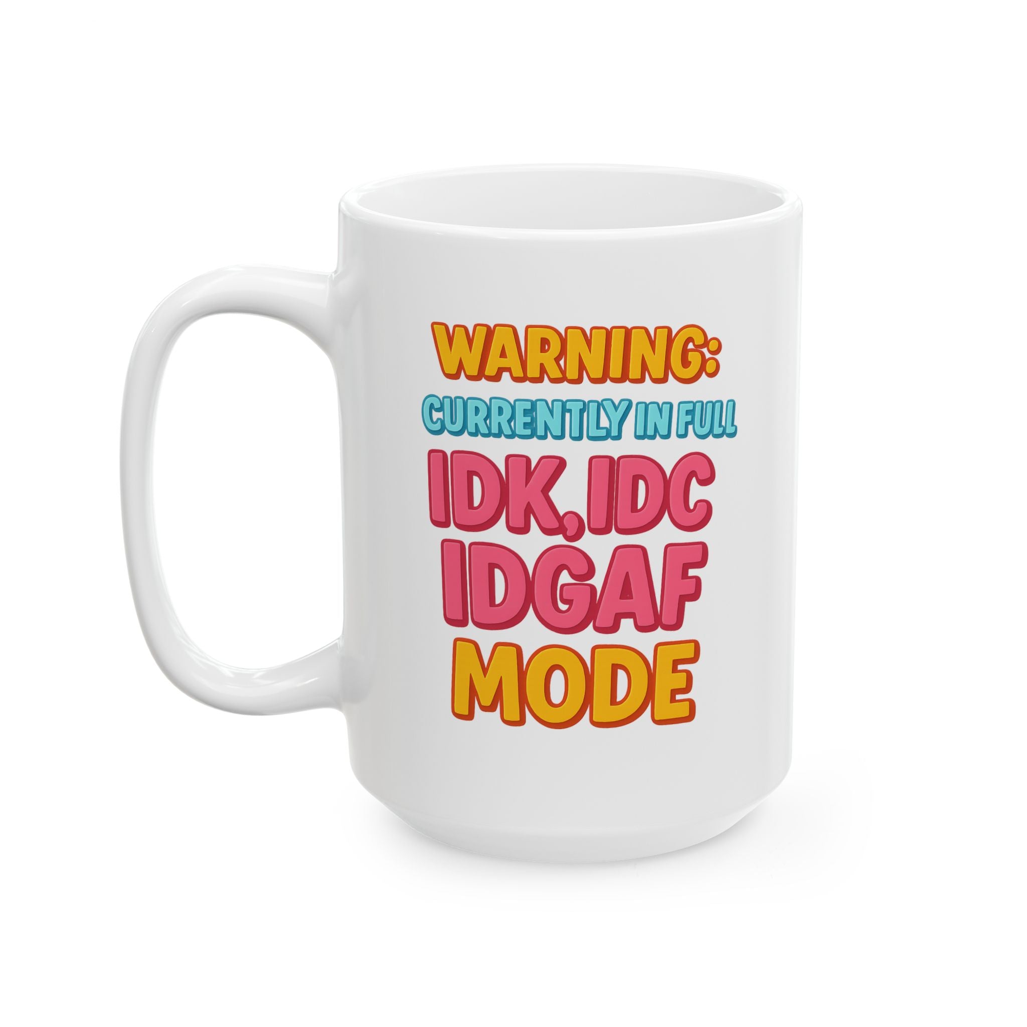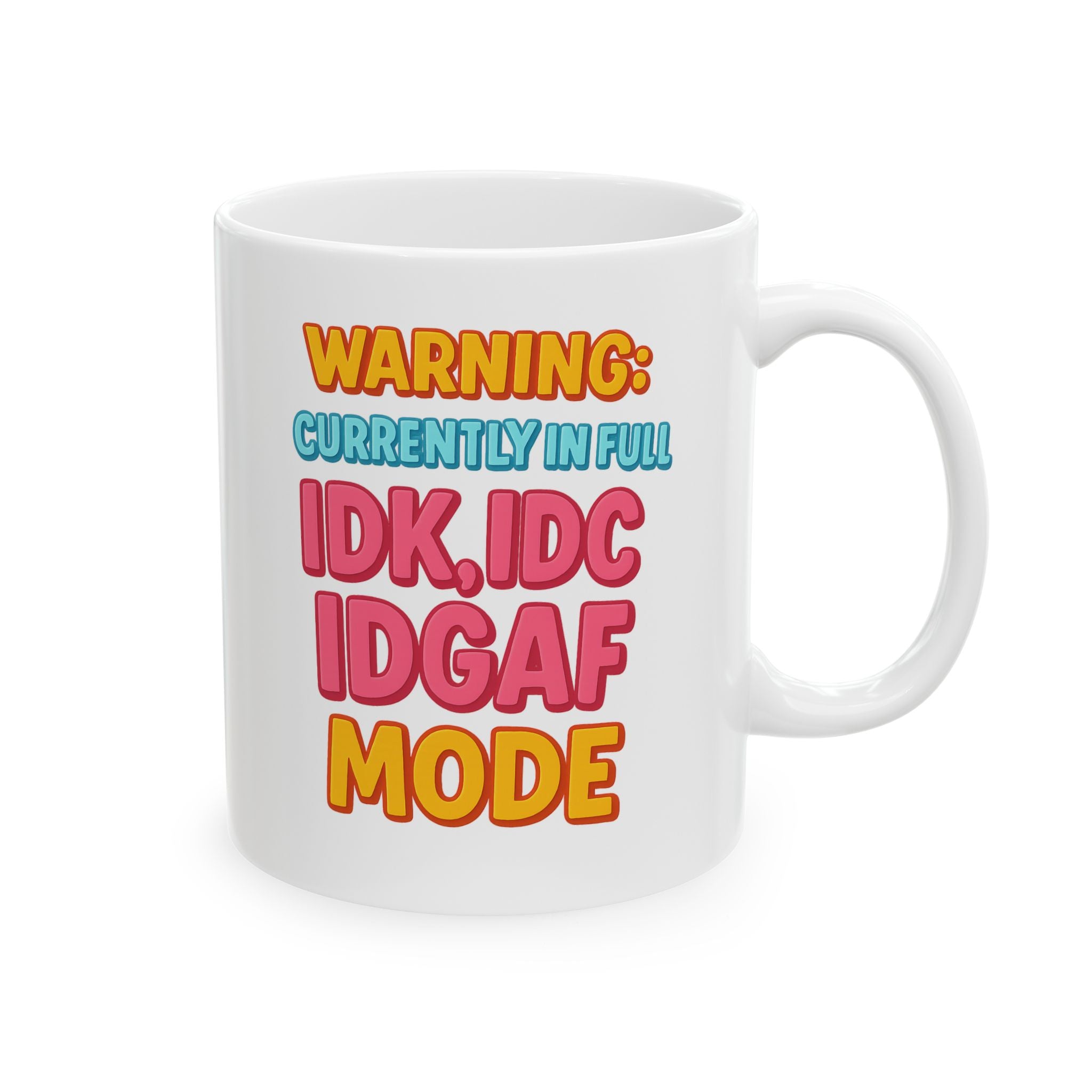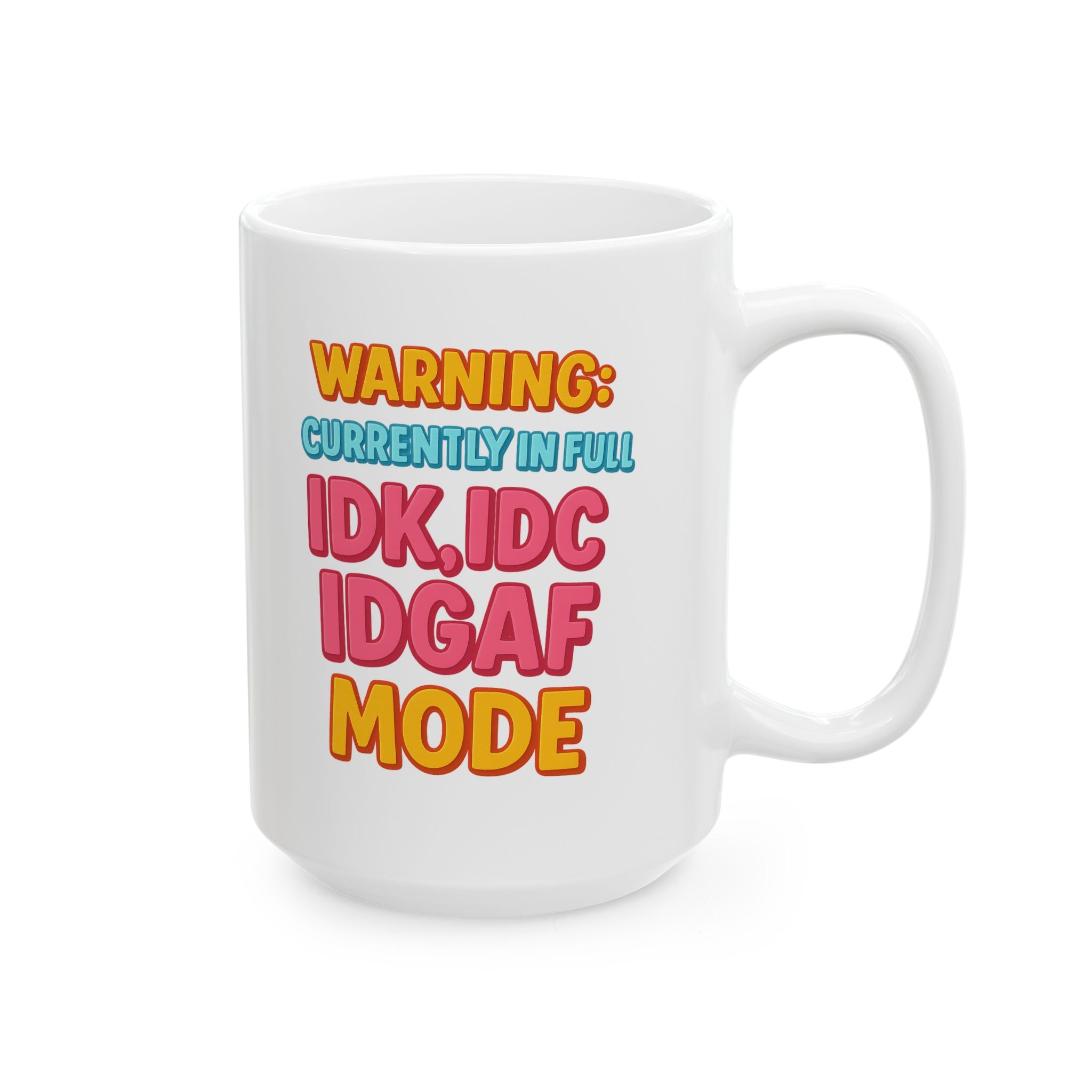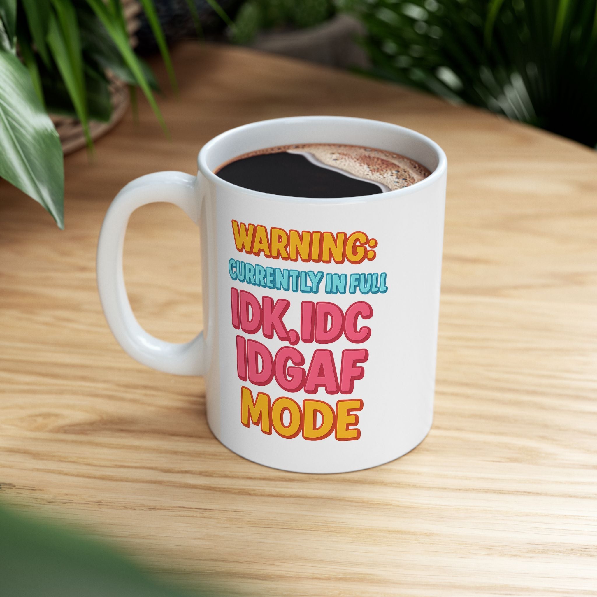 Funny IDK IDC IDGAF Mode Mug - 11/15oz Ceramic Coffee Cup with Sarcastic Quote - Humor Gift for Friends, Coworkers, Him or Her