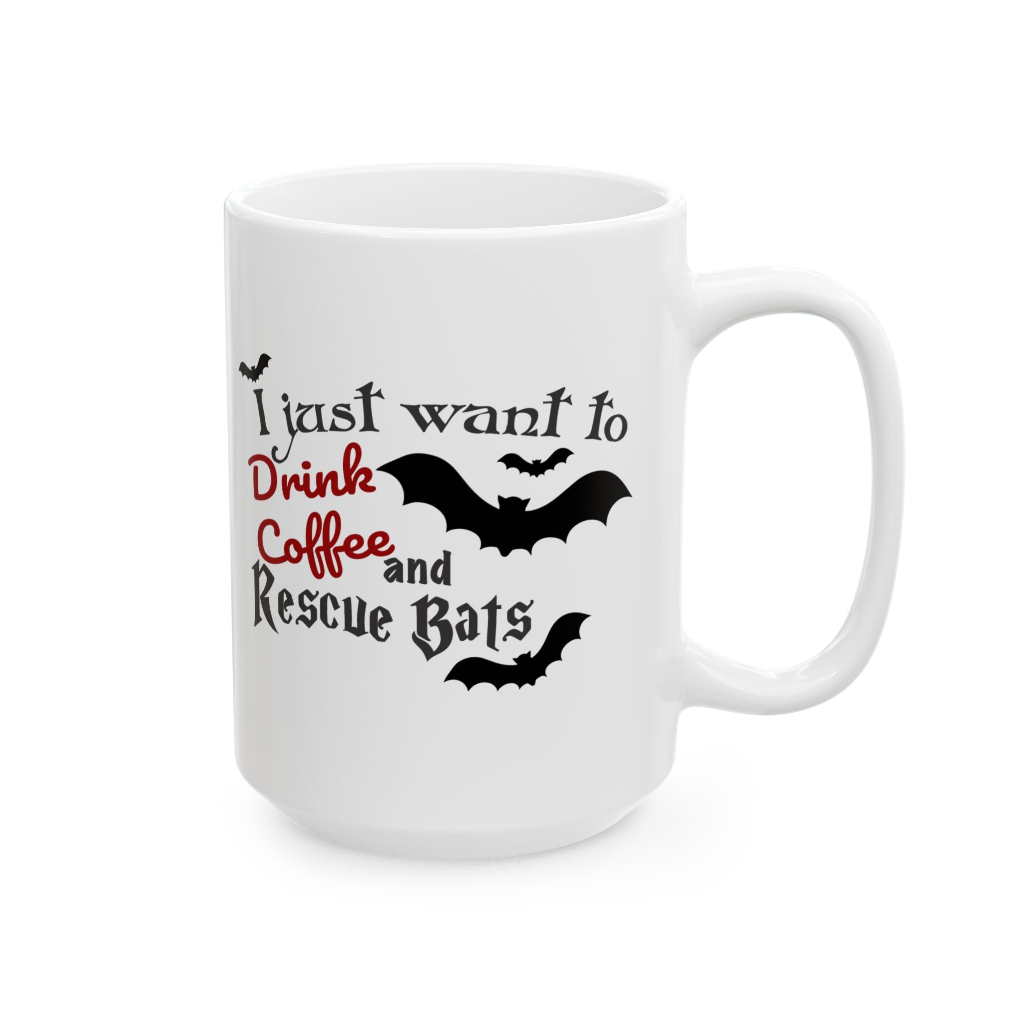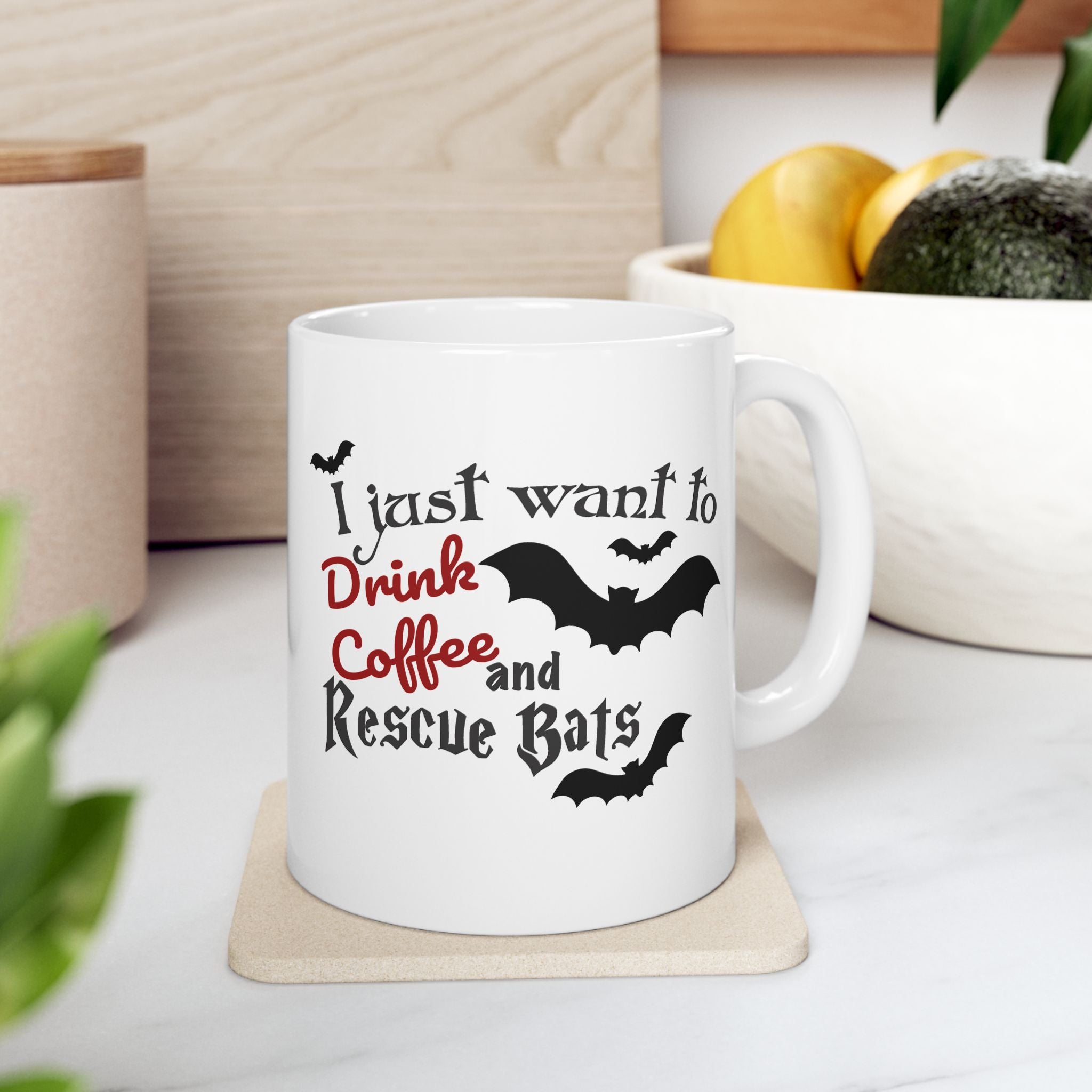 Halloween "Bat" Coffee Mug - "I Just Want to Drink Coffee & Rescue Bats" White Ceramic Novelty Cup (11oz, 15oz)