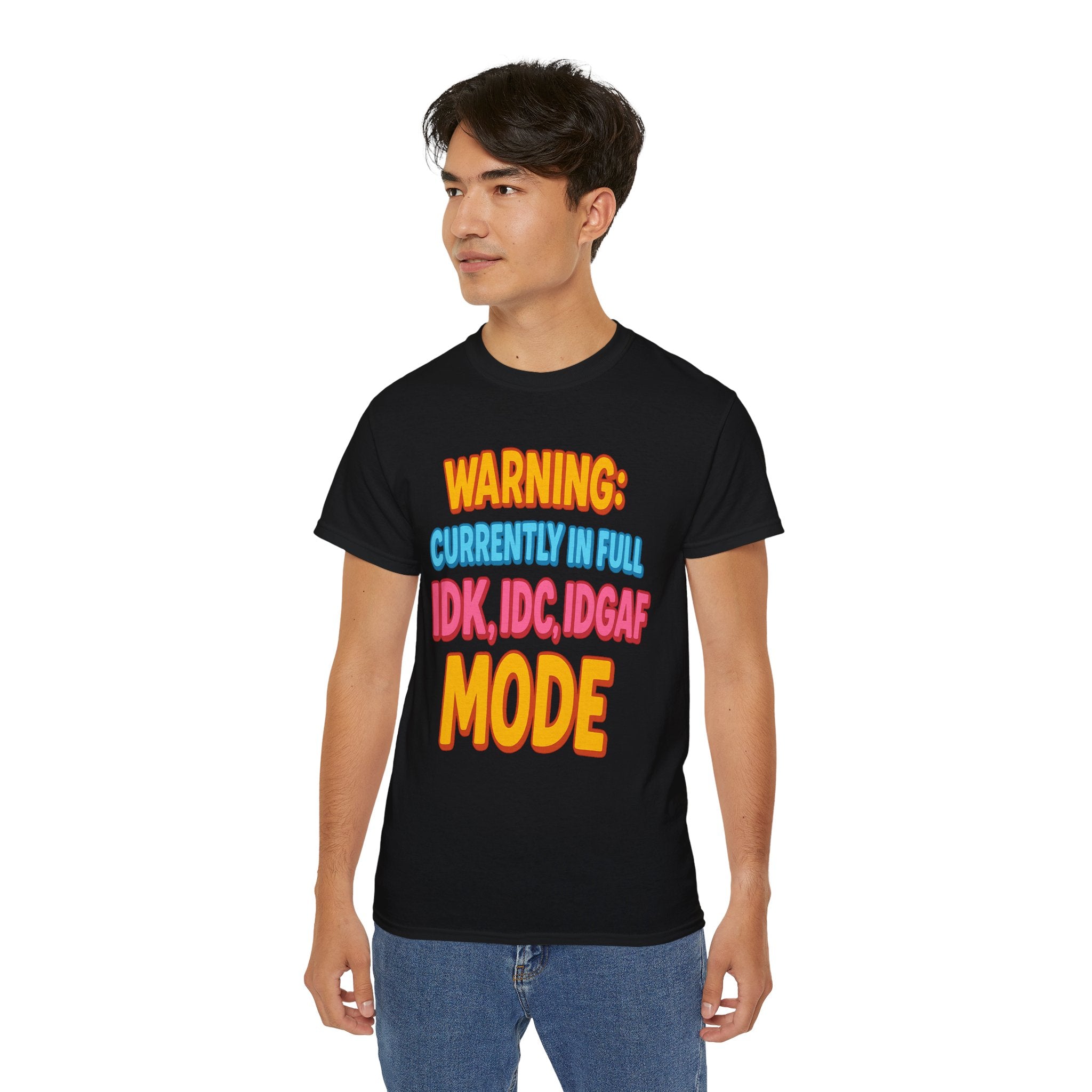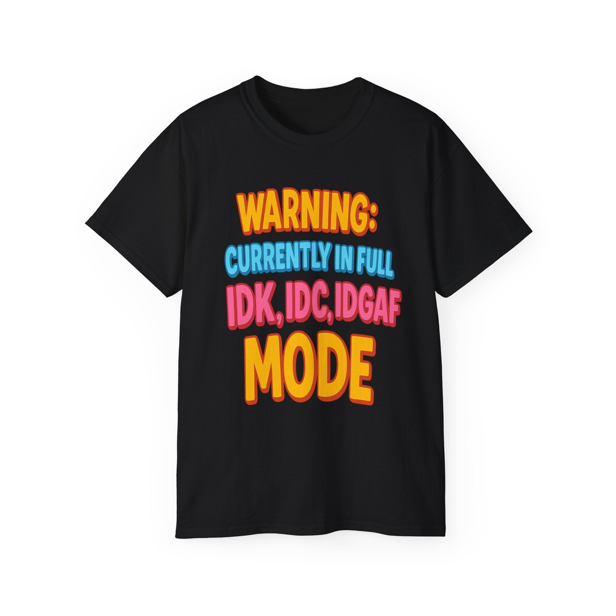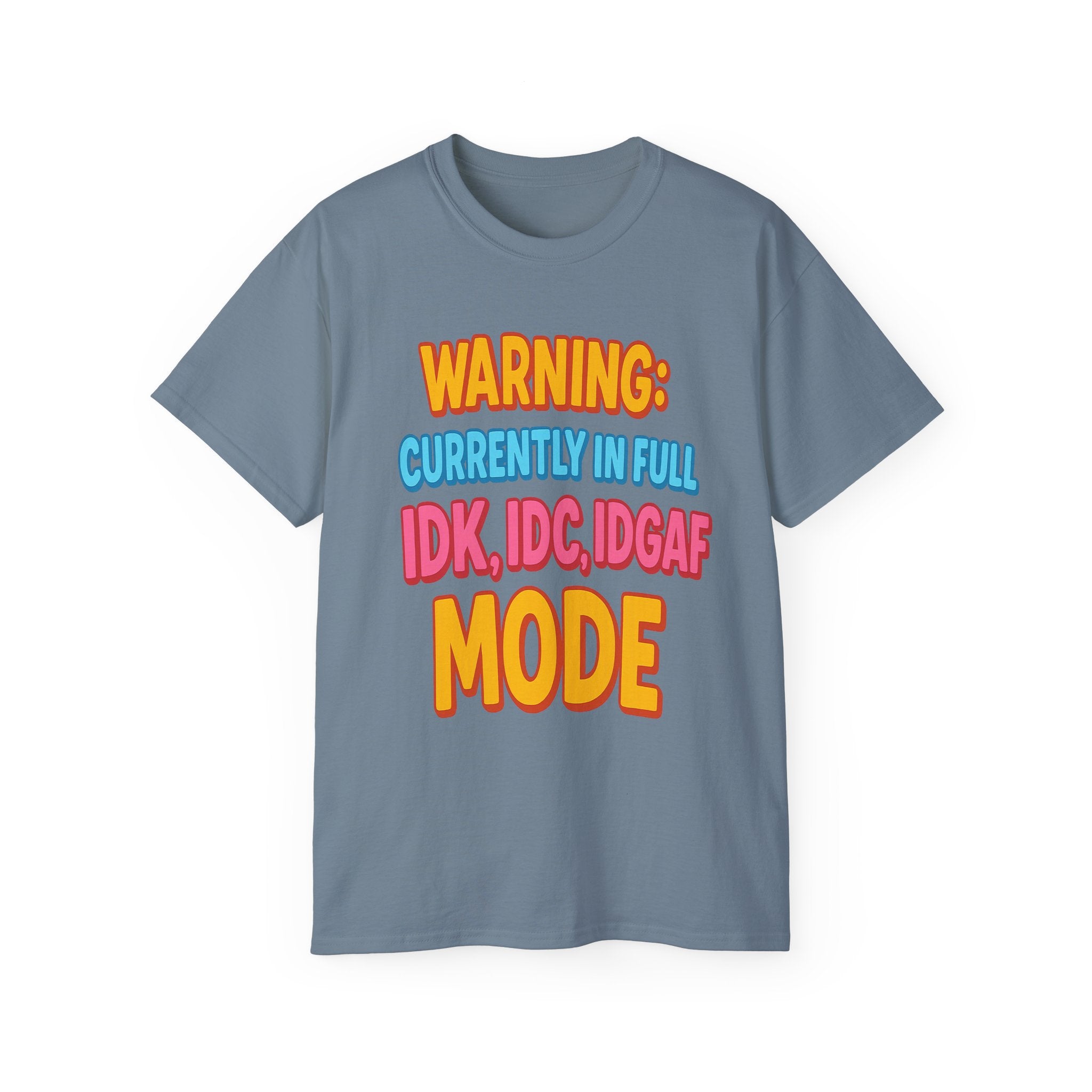 Funny Graphic Tee "Warning Currently in Full IDK IDC IDGAF Mode" Shirt | Trendy Sarcastic Quote T-Shirt for Men and Women