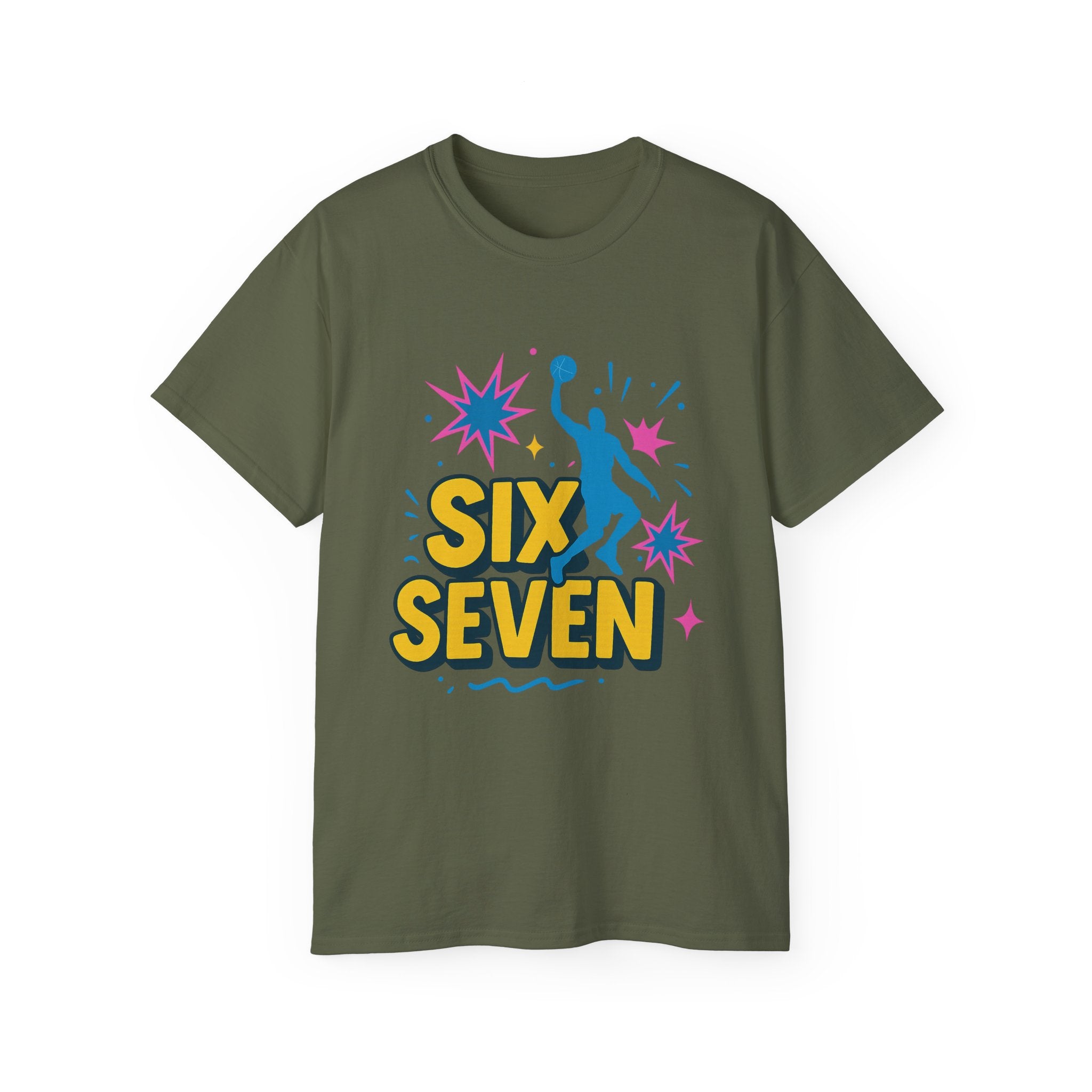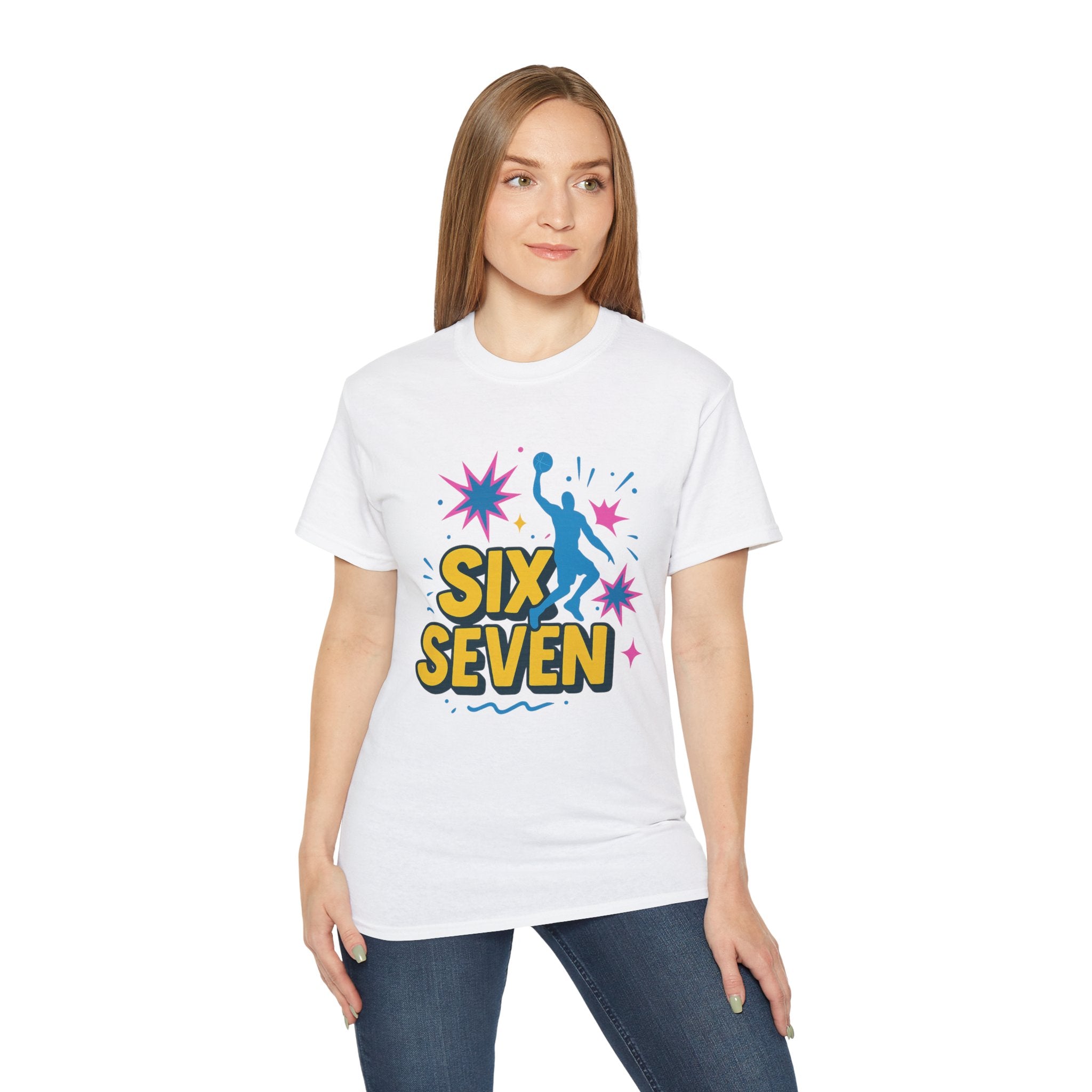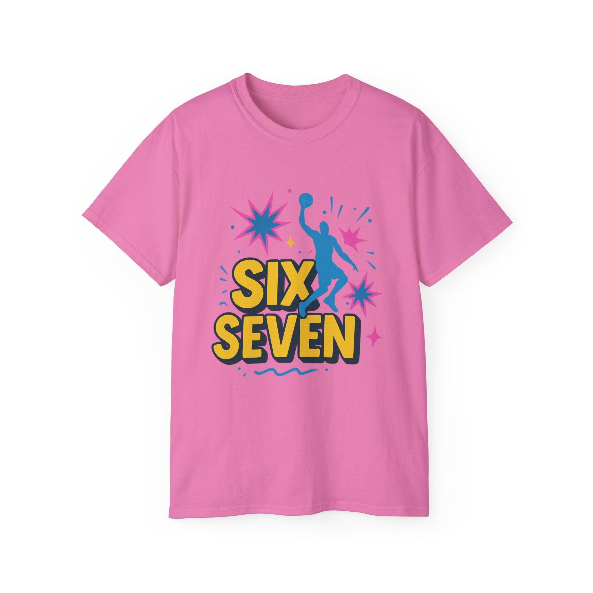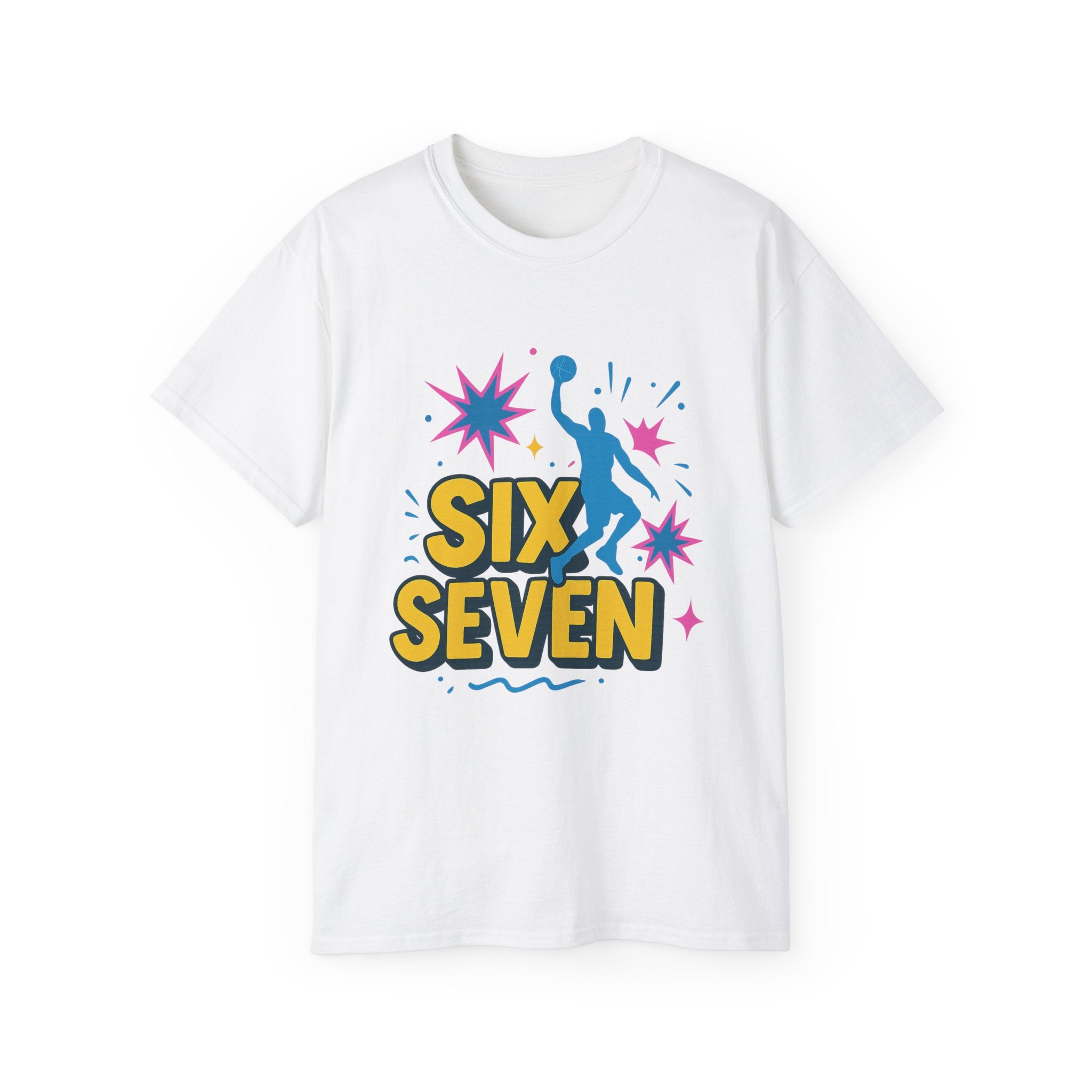 Featuring a high-quality print of the iconic “Six Seven” phrase, a dunking silhouette, and comic-style bursts, it’s perfect for fans of basketball, viral culture, and chaotic Gen Z/Alpha energy. Soft, breathable, and unisex - it’s built for everyday wear and endless reactions.